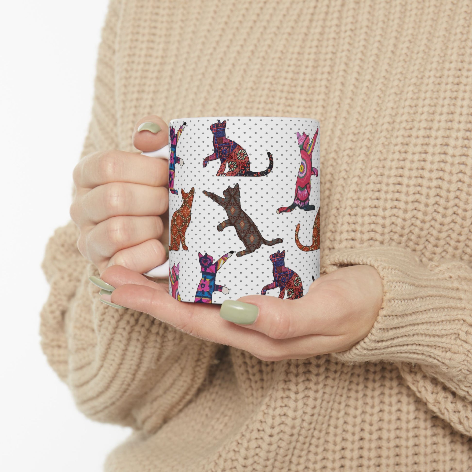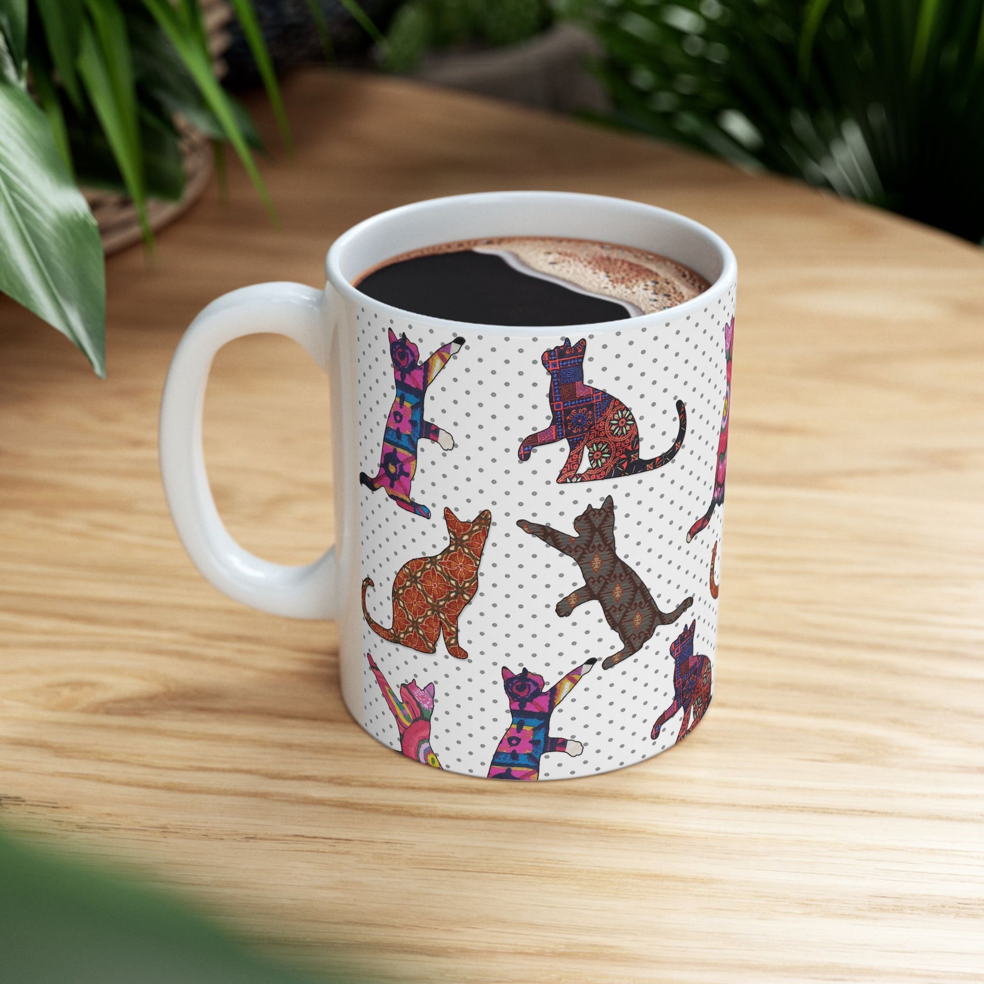 Show your passion for pussycats in a neater way than with words alone with this unique mug of Silhouette cats in eye-popping patterns and colors. This cup exudes cat chic vibes and is bound to be the cat's meow in any trendy kitchen and ideal for gifting on birthdays, holidays, and any occasion that calls for a smile. Meow!